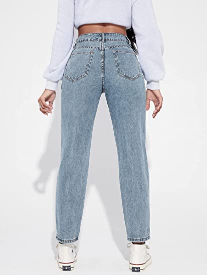 Feature: high waist, zipper fly, button, pockets, straight leg, mom jeans.